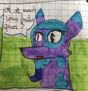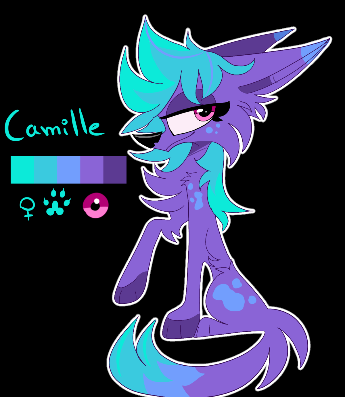 Camille is a character that I created in 2020, at that time I had created a comic that was talking about me and my life at school. The character of Camille represented my best friend from school. At first this character was just purple with blue spots, but I gave her a redesign which you can see above.
