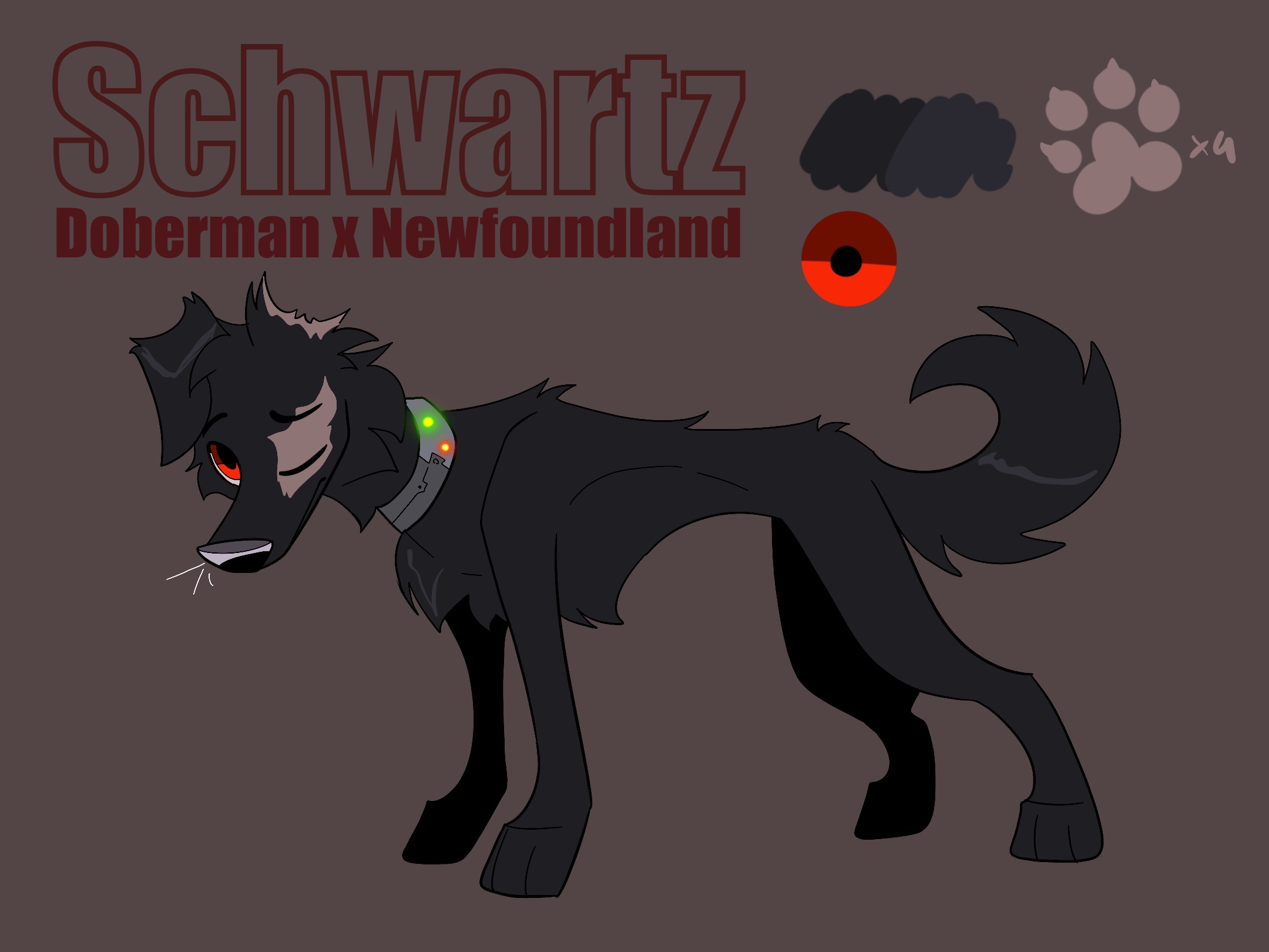 Schwarz is a huge Doberman and Newfoundland mix. He no longer has a right ear and a right eye. His fur is shiny and quite long. He works for the Storms but still hasn’t gotten his Storm name and wears this kind of electronic collar. He almost never speaks, he has a very cold character, he shows almost no emotion. He does what he is asked in silence, when he is free, he wanders the territory of the Storms in solitude. He doesn’t even know why he lives. Everyone calls him «Coeur Brisé», which in French means broken heart.