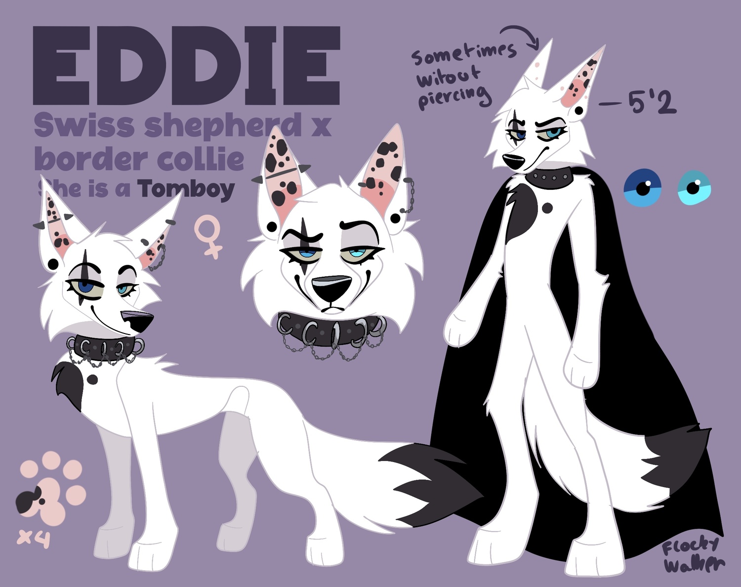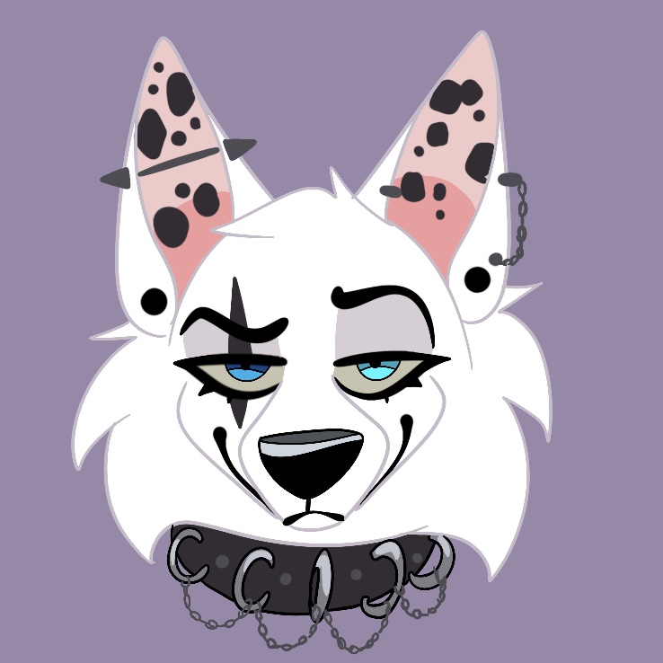 Eddie is a small white Swiss Shepherd. She has blue eyes but she has heterochromia as well: her left eye is light blue while her right eye is dark blue. It still looks like she has a scar on her right eye but it’s just a black spot, indeed. She has spots everywhere, like in her ears, and on her fur. She wears lots of earrings and a collar with chains and spikes. Sometimes she also wears a black cape. Eddie is a very capricious personality, she is 17 but behaves like a 9 year old child. She lives with the Storms but she’s completely unaware of the war, even being among the bad guys and the vilains, she has no hatred against the Nix Region and don’t care about the situation. Her only goal: become Flockstorm‘s apprentice. Her behavior and her personality are not at all up to her physique. She seems to be very charismatic, but that’s not the case. She is sometimes a bit silly, and loves to ask stupid questions. She enjoys being with her «grandfather» Blackstorm, who is nice to her because she is Shuba‘s daughter. Despite her somewhat crazy character, she is highly respected in the Storms camp.