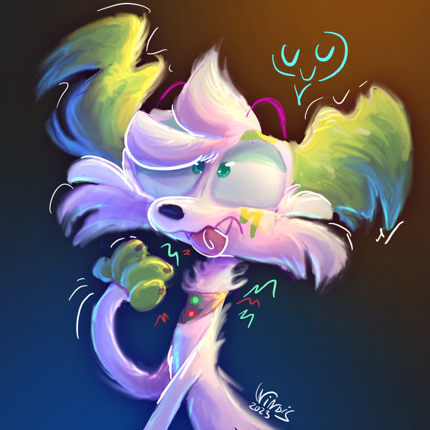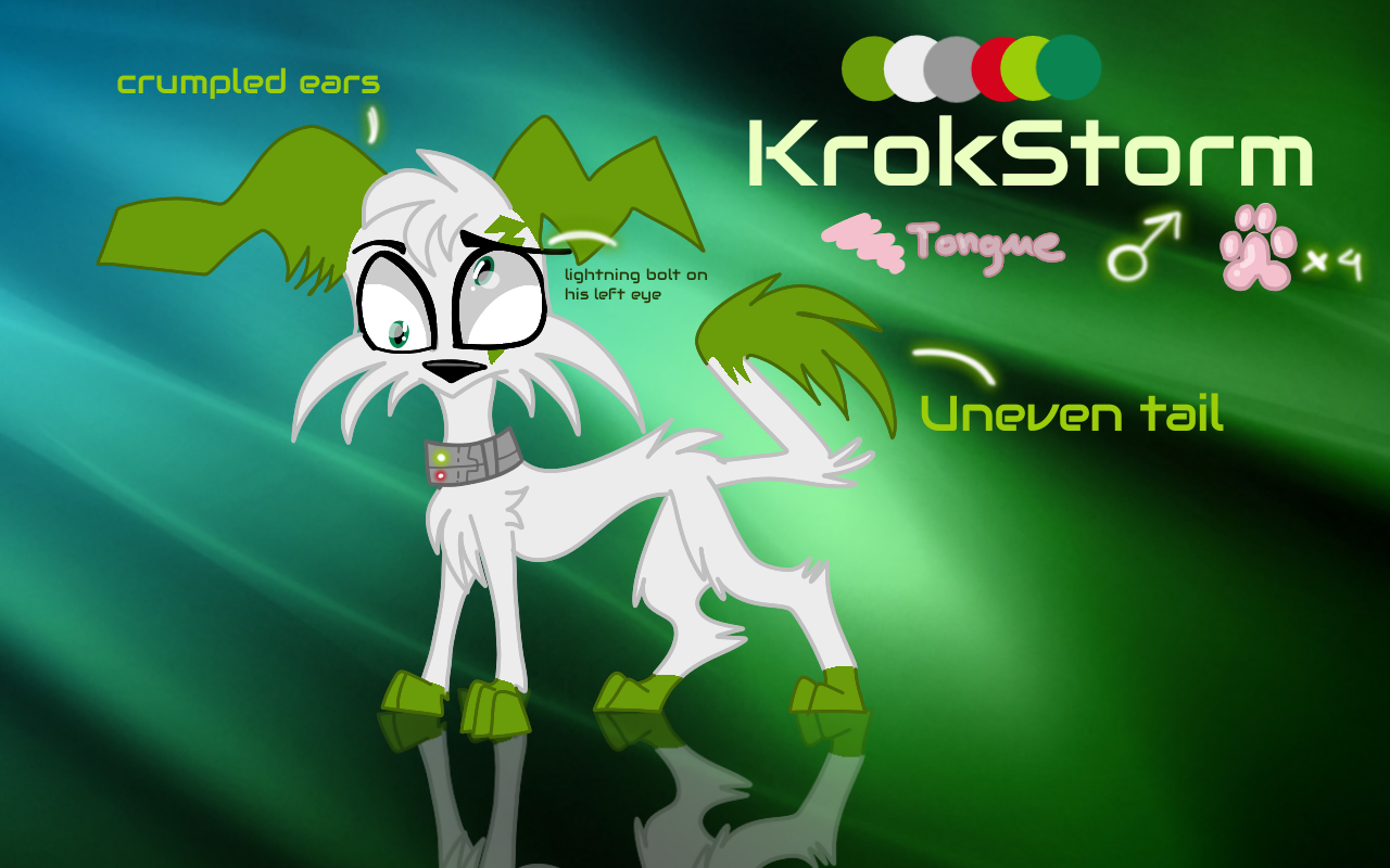 Krokstorm is a small white wolfdog. His ears, legs and the tip of his tail are green, he also has a lightning mark on one eye. His tail is broken and his ears are wrinkled. He can’t keep his eyes straight and control his own eyes so they go off in everywhere. He wears an electric collar which means he is not a big enough Storm and is submissive to the bigger ones. He is very clumsy and very weak. He is therefore not often sent on important missions. He is unsuccessful but it is not by bad luck. This character has another side, sometimes, despite his stupidity, he can be quite intelligent and manages very well to imagine a plan that will work. But he is often sent on patrol or on guard.