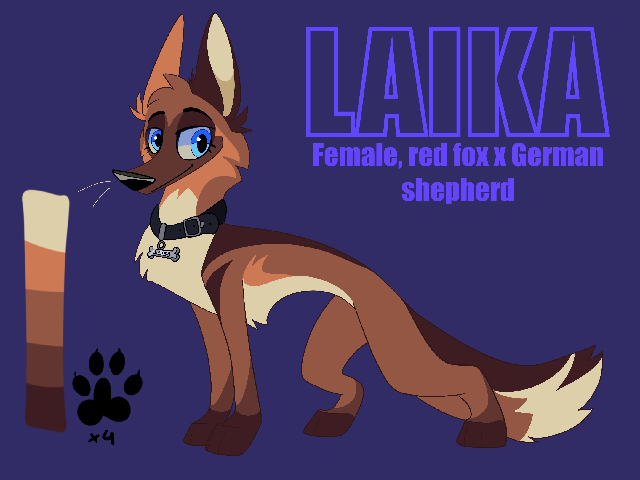 Laika is a half-fox German shepherd, she has blue eyes. She always wears her collar with a bone-shaped medallion. She may also sometimes wear a police dog harness and outfits. Laika is really the police itself of the territory of the Nycks region. She is really very passionate about her job. Since she was little, she has been a police dog. She carried out the majority of the missions she succeeded in. She likes working in a team but so that everyone agrees and is satisfied. She has a very extrovert character, she is very energetic and very friendly with others. When it comes to a new mission, she is always ready as ever and gets started right away. She is very serious and intelligent and does things with care.