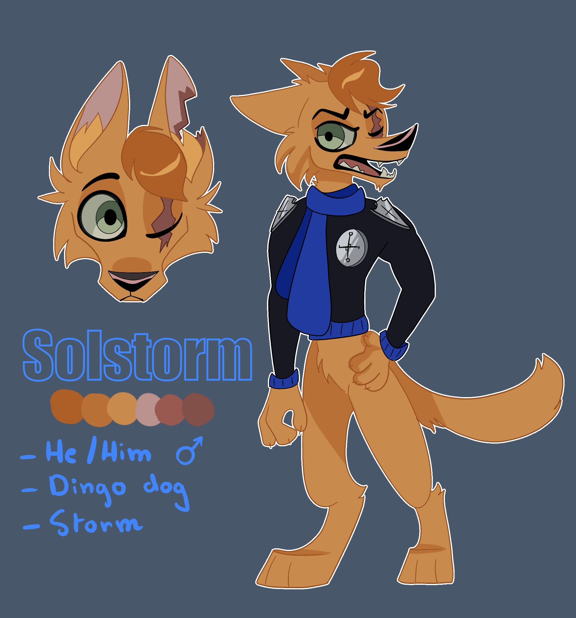 Solstorm is the second general. He commands and often gives orders. He’s a ginger dingo, he only has one eye, which is green. His left ear is completely torn and has a major scar over his left eye which he lost. He also has a ginger fringe. Solstorm always wears his blue and black uniform and dark blue scarf. On his chest, he has the Storms medal with their sign on it, which means he has some importance.